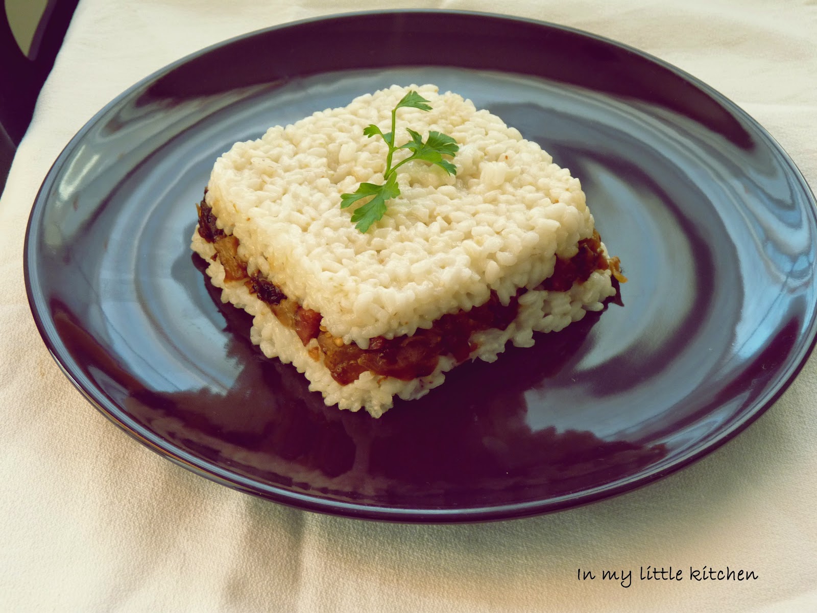 Para la presentación, yo puse un bol cuadrado. el el fondo, se pone una capa del arroz blanco, luego ponemos una capa de berenjenas con el jamoncito, y luego una capa de arroz. Presionamos un poquito y volcamos.