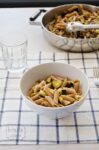 Pelamos las berenjenas, las picamos en dados y las añadimos, sazonamos y cocinamos todo junto.
