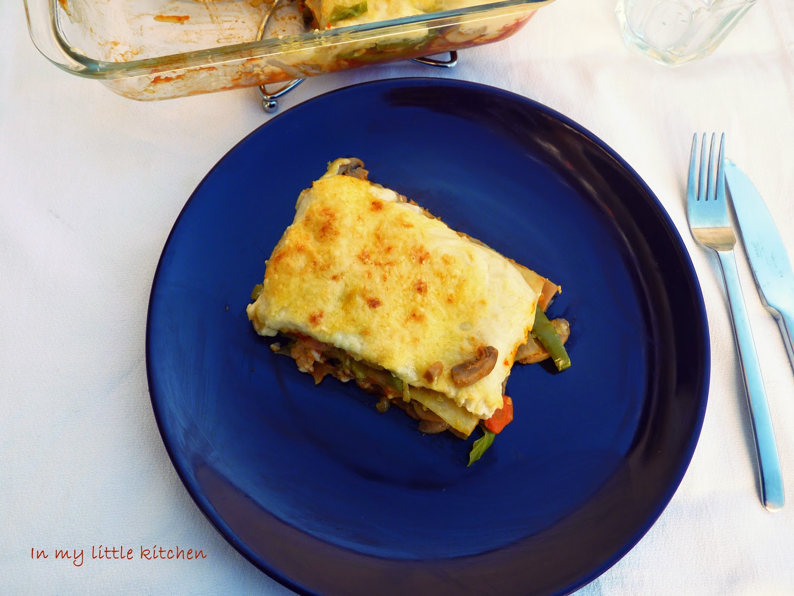 El plato que hoy os traigo podría valer como comida de Navidad o de Año Nuevo, he leído en algún sitio que hay gente que en Navidad come canelones, así que ¿por qué no probar con una lasaña de verduras?. Es muy ligera lo cual viene muy bien para desintoxicar de los excesos navideños. Está muy rica y seguro que triunfáis con ella.