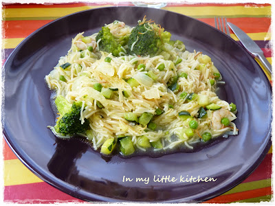 He llamado a la receta falsa fideuá porque como vereis no es una fideuá al uso, no lleva los fideos gordotes que caracterizan este plato, pero aún así está muy bueno, es muy sano, está hecha a base de verduras y he añadido alguna gambita para que no fuera tan verde la cosa.