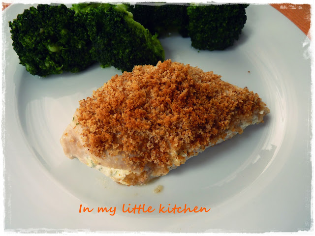 Cuando leí la receta no estaba yo muy convencida de hacerla porque al ir el pollo a la plancha y luego al horno y luego ponerle pan rallado encima…, me parecía que se me iba a quedar muy seco, pero no, como las pechugas van rellenas, resultan muy ricas.