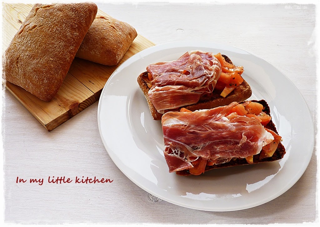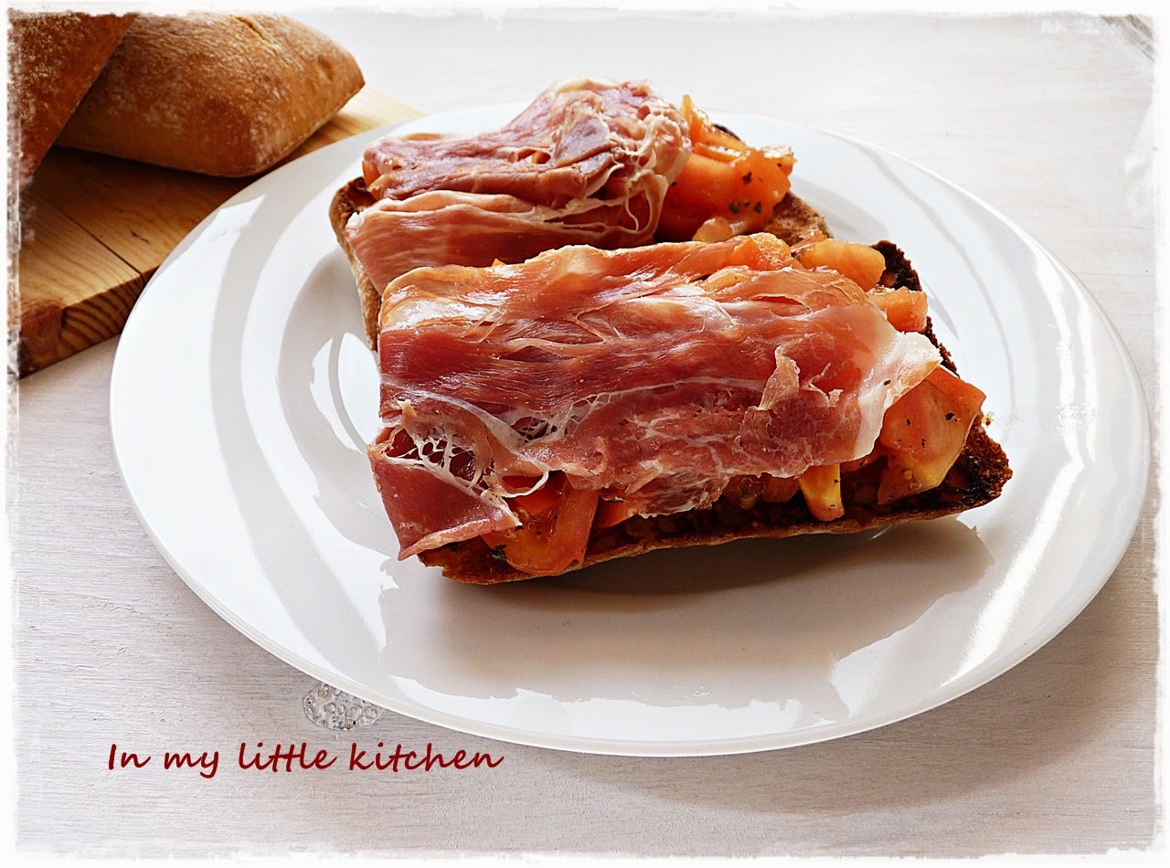 Me encantan las bruschettas, en casa son un gran comodín para las cenas y en un momento te preparas algo delicioso sin manchar. Esta con jamoncito es una delicia.