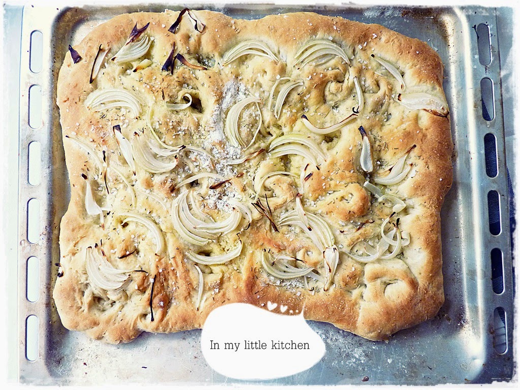 Me encanta la focaccia, hace ya tiempo hice una para hacer la prueba y salió buenísima, la hice simple, con hierbas aromáticas, y encantó en casa, así que ahora he intentado incorporar la cebolla como nuevo ingrediente. He de decir que ha habido división de opiniones en casa, al pinche le gusta más la simple y a mi me ha gustado más esta, así que empate.