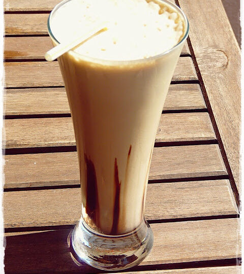 Mezclamos todo en la batidora y servimos, yo le puse un poco de sirope de chocolate en el fondo del vaso, y el sabor es…., probadlo y me decís.