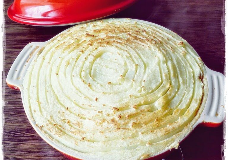 Precalentar el horno en la función grill. Poner la carne picada en la cazuela que vamos a utilizar, cubrir con el puré de patatas y decorar a nuestro gusto. Gratinamos durante 10 minutos.