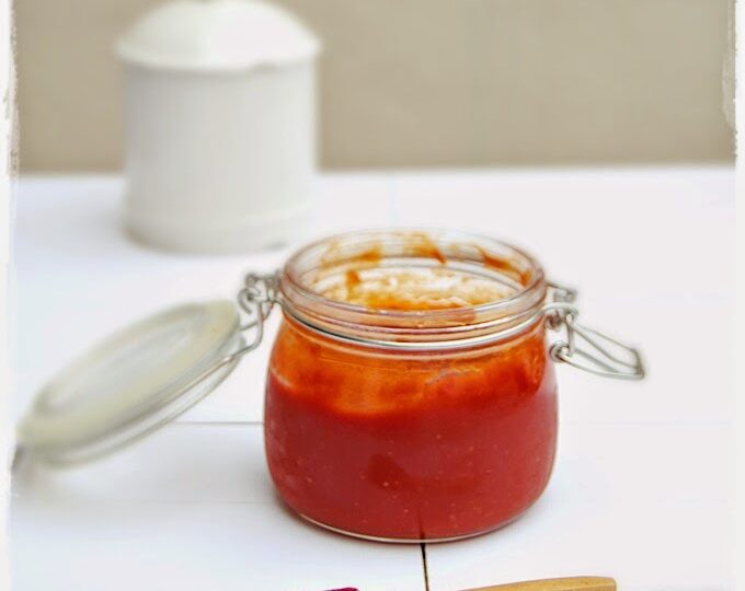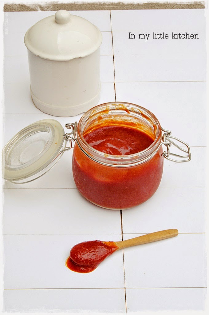 Me encanta el ketchup, no lo puedo remediar, no concibo una hamburguesa o unas patatas sin ketchup, (no se lo echo a todo, no me gusta ponérselo a la tortilla de patatas por ejemplo, para mi es un sacrilegio ponerle salsas a la tortilla), pero lo malo que tiene es que el industrial tiene un montonazo de azúcar, y eso se me va directo a las cartucheras, barriga y demás, así que decidí hacerlo yo misma. El resultado es estupendo, la textura como podéis ver es muy parecido al industrial y el sabor…, pues yo creo que es mejor. Os dejo con él.