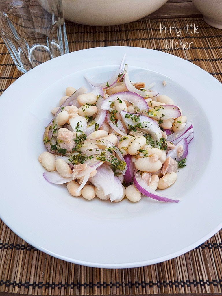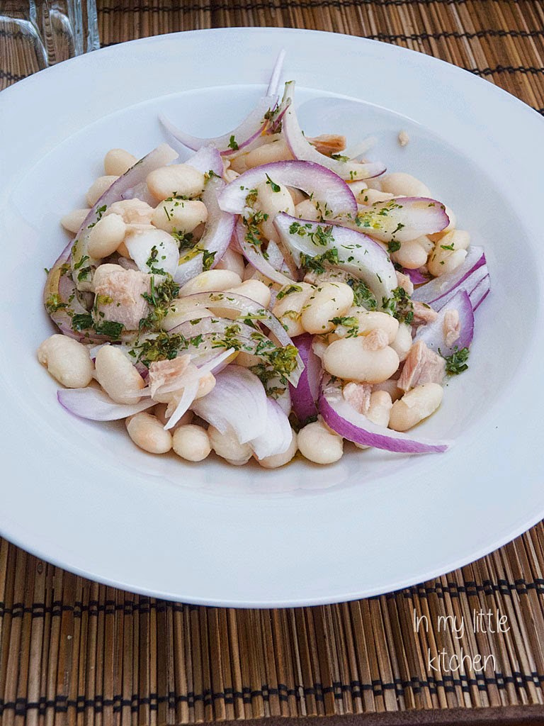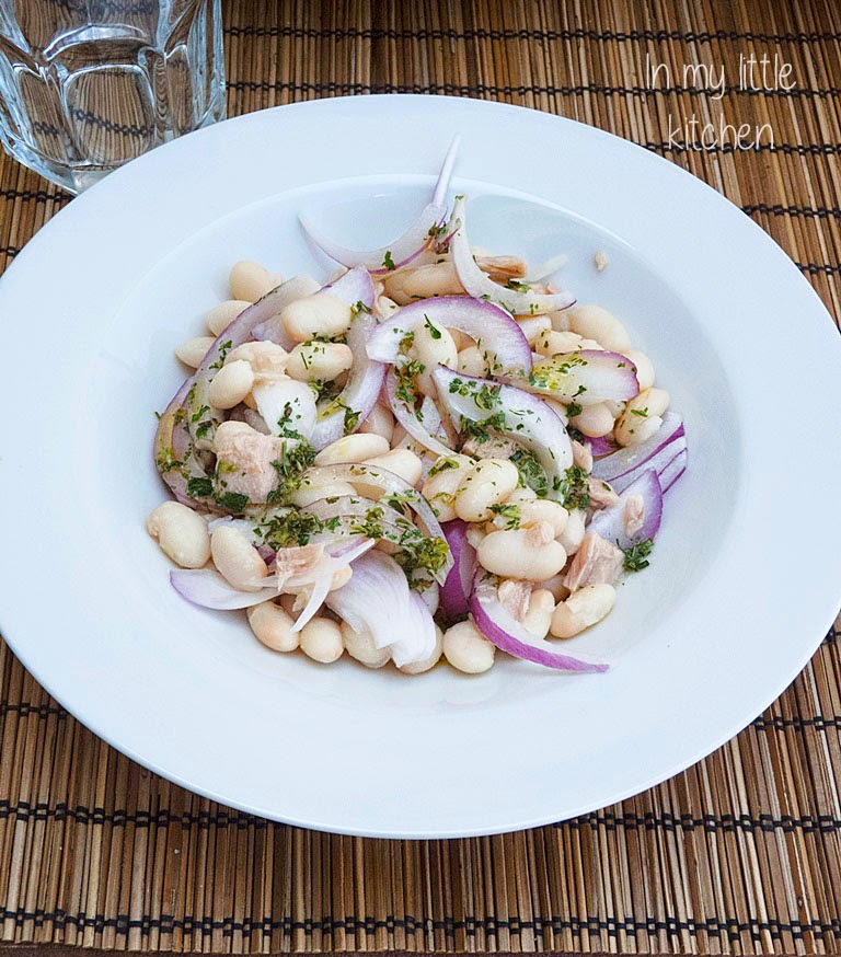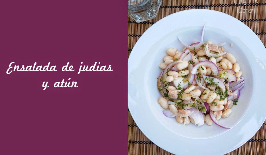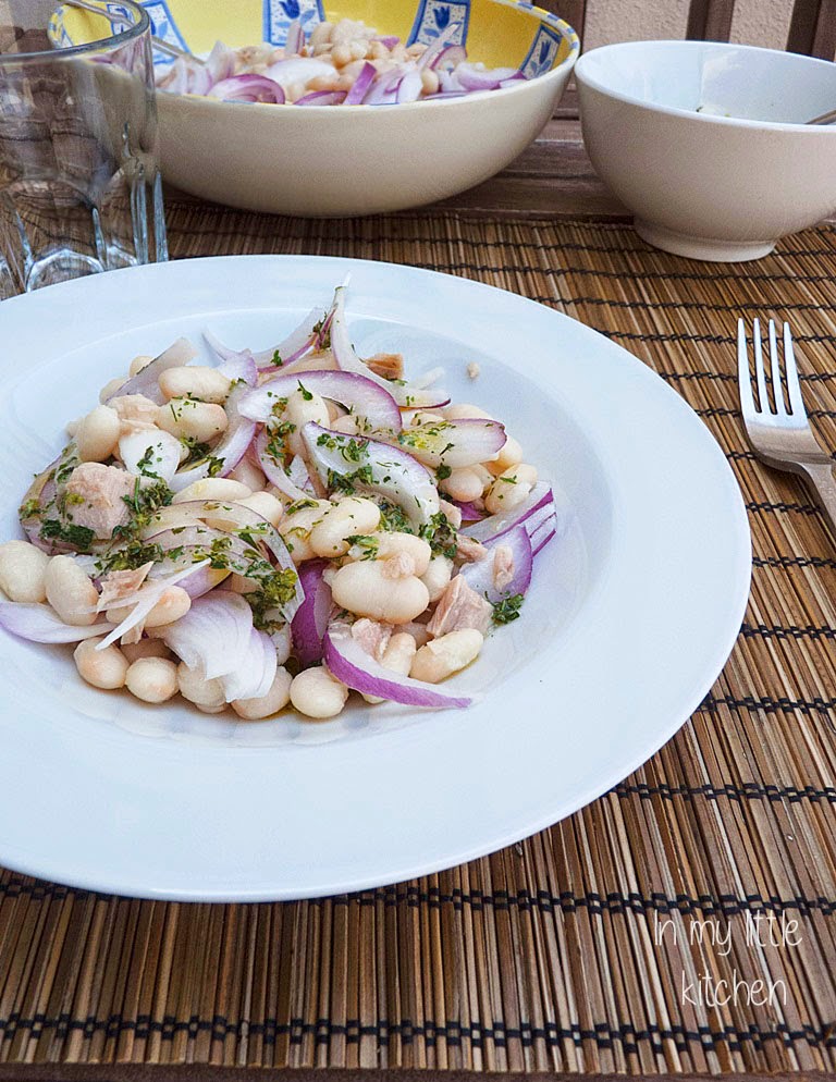 Escurrir las judías, y ponerlas en el bol en el que vayamos a servir la ensalada. Partir la cebolla roja en rodajas y ponerla por encima. Agregar la lata de atún.