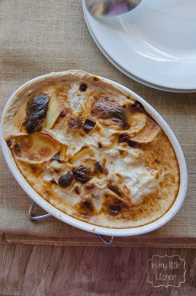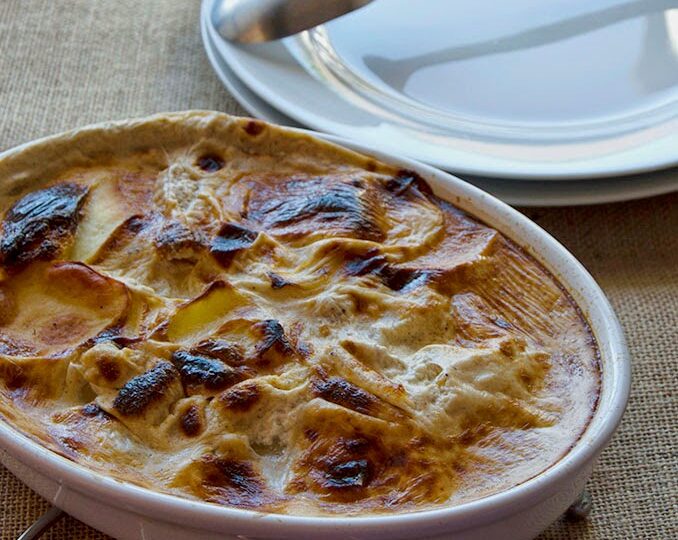 La receta que os traigo hoy es un gratinado de patata que sirve como acompañamiento a las carnes o chuletas de cordero, por ejemplo. La receta la he visto en el libro de mi adorada Rachel Khoo, pero estas patatas las llevo comiendo años en casa de mis suegros, y he de decir que casi he conseguido que me queden tan ricas como a mi suegra.