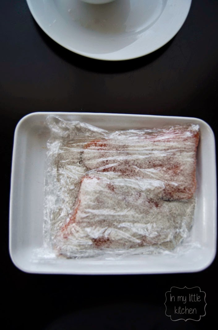 Sobre un film transparente que se habrá puesto sobre una bandeja, colocar un poco de la sal y encima los lomos de salmón, cubrir con el resto de la sal.