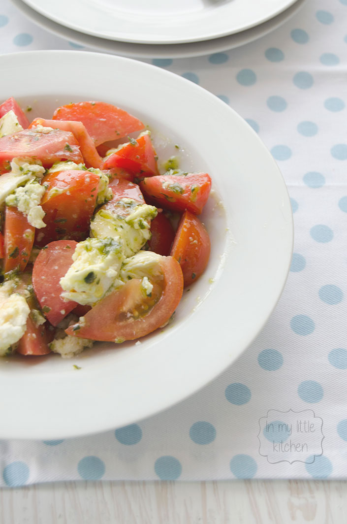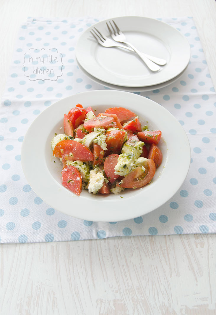 Por esta razón he intentado hacerla más o menos como yo vi que esta hecha la que nos sirvieron y el resultado, aunque no ha sido el mismo, no está nada mal. Yo siempre había hecho la ensalada caprese cortando el queso, y aquí nos lo pusieron como desmenuzado, y esta vez he desmenuzado el queso. Puede que visualmente no sea lo más bonito del mundo pero os puedo asegurar que está riquísima.