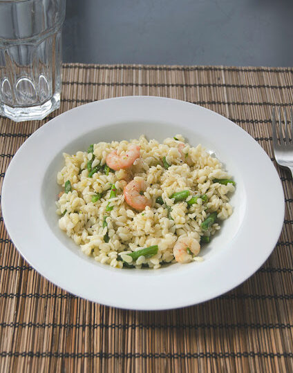 Escurrir la pasta y mezclarla con los espárragos y las gambas.