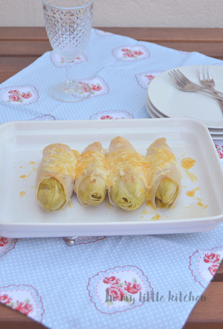 Cuando vi en un libro de los que tengo por casa una receta en la que cocinaban las endivias, pensé «esta es la mía, seguro que así logro que me gusten» y no me equivoqué, aunque mantienen algo el amargor resultan deliciosas con el pavo y el queso por encima.