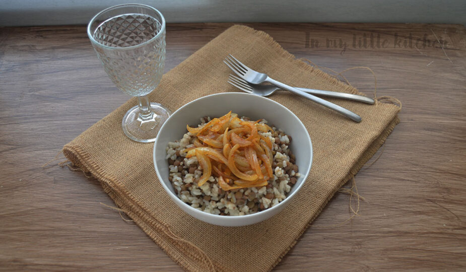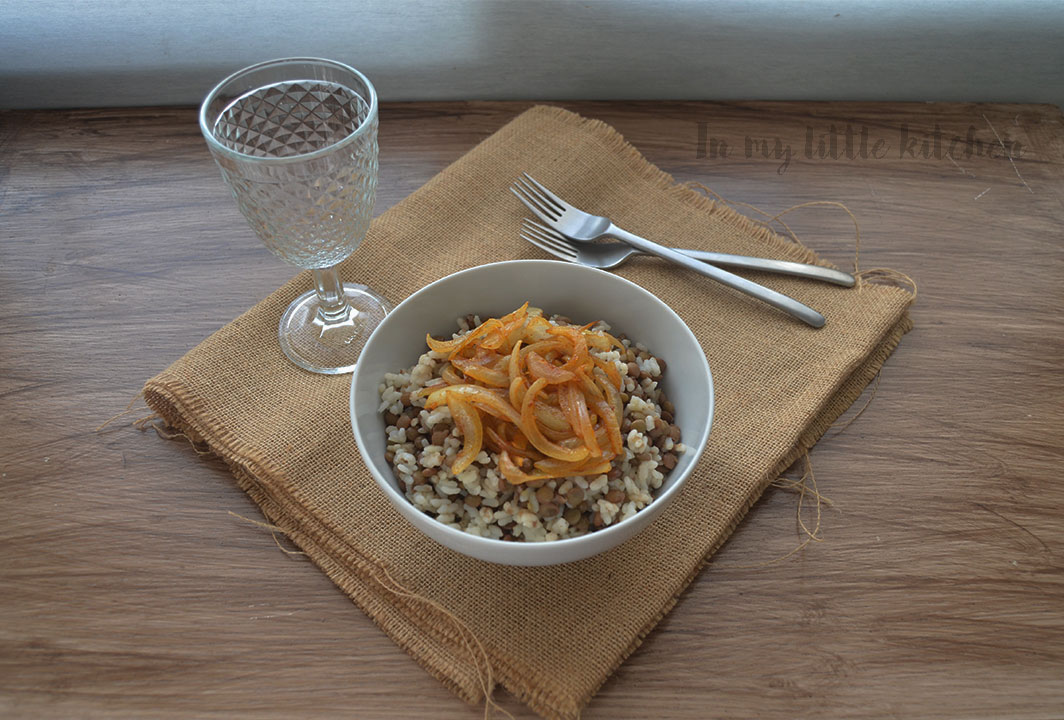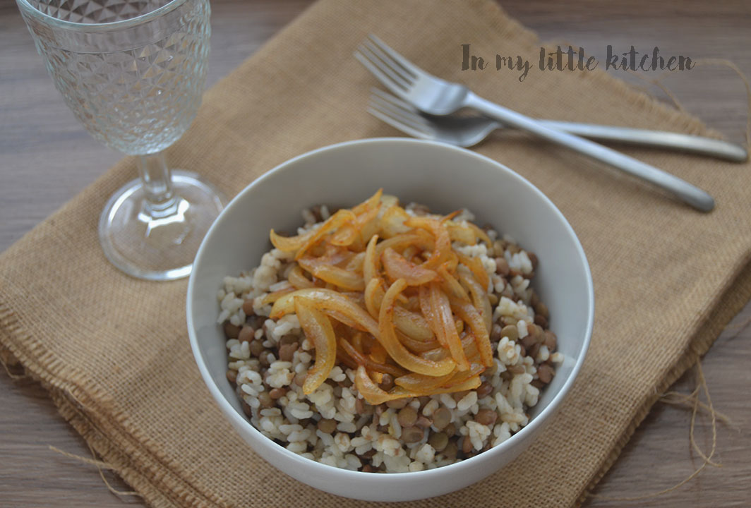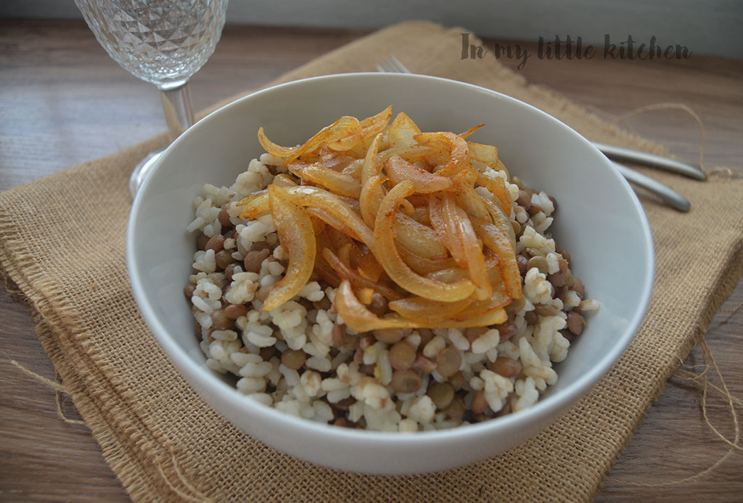 Cuando vi esta plato por Pinterest, me llamó mucho la atención, la mezcla de lentejas con arroz y encima la cebolla, me dieron ganas de probarlo, y la verdad es que me ha encantado. Qué cierto es eso de que la comida entra por los ojos.