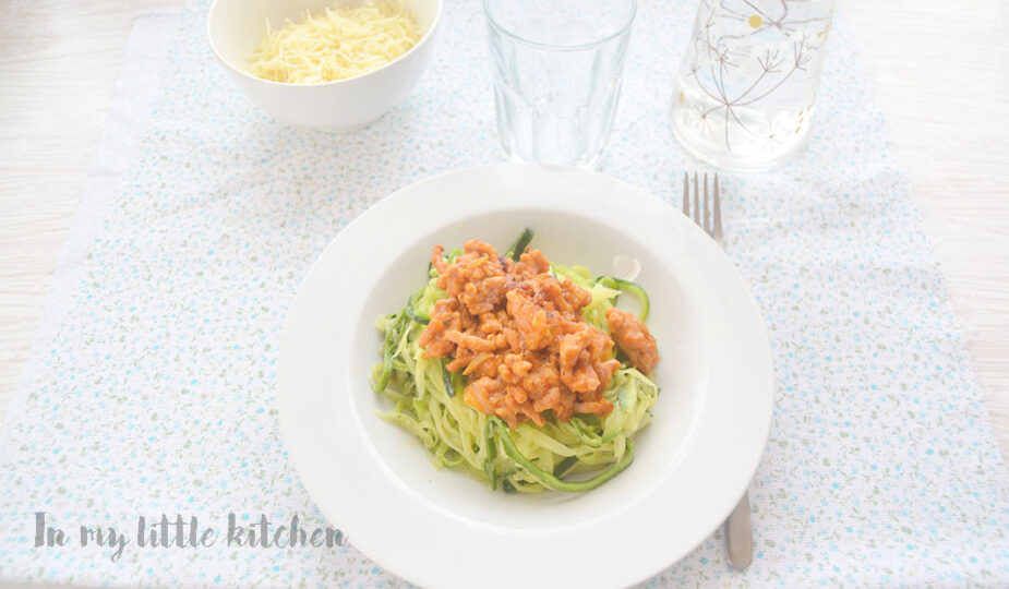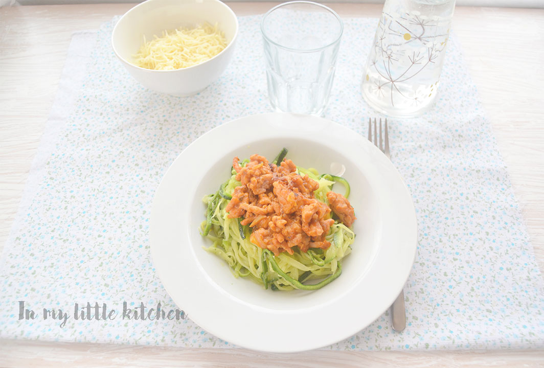 Servir los calabacines y poner encima la boloñesa. Si queréis podéis coronar con queso rallado.