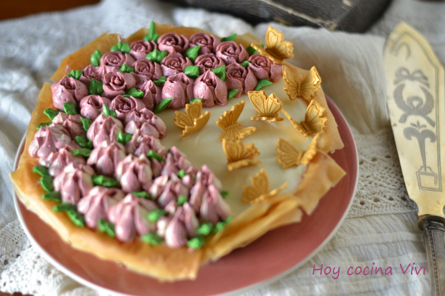 Tarta filo de mousse de cava y flores de buttercream de Hoy cocina Vivi.