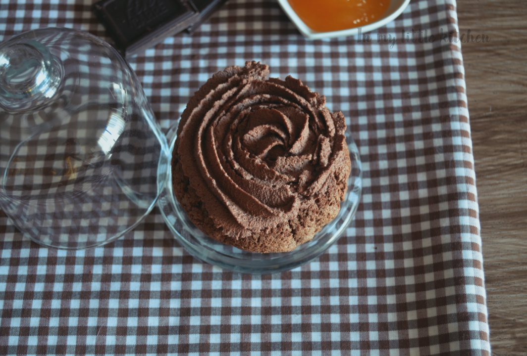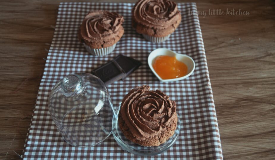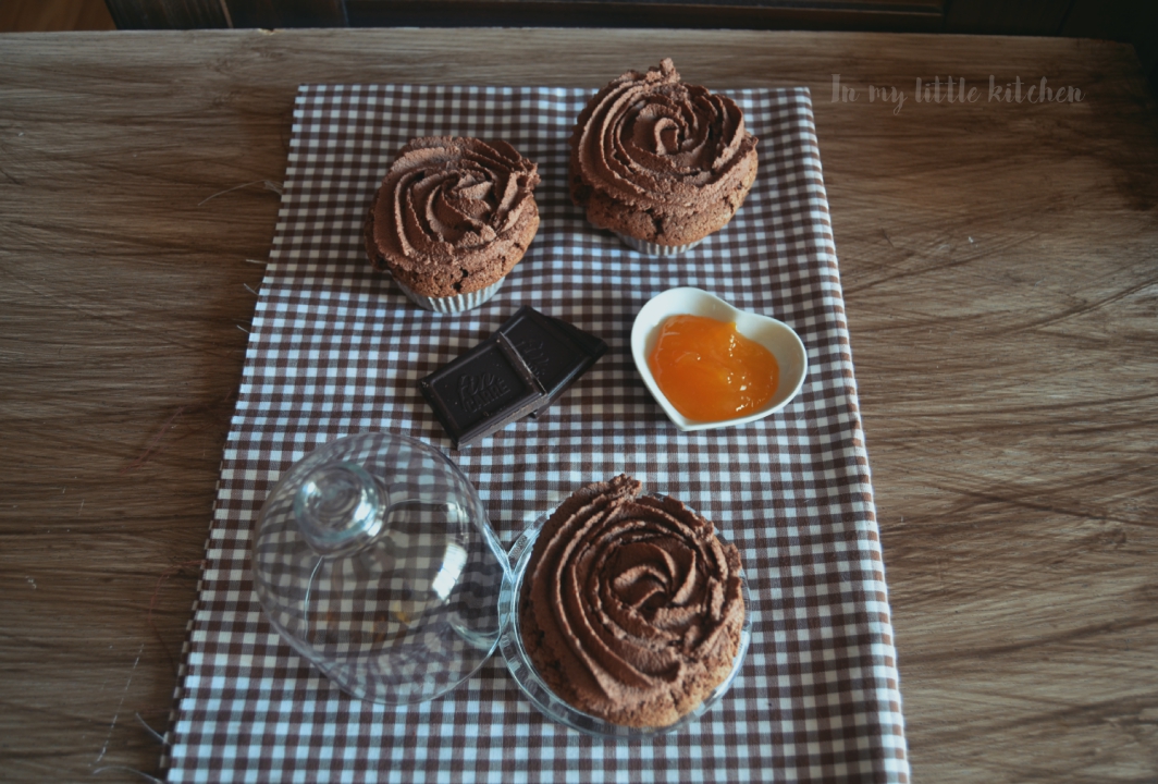 Con un descorazonador de manzanas, vaciar el centro de los cupcakes (que ya estarán fríos) y los rellenamos con mermelada de albaricoque. Volver a tapar con lo que hemos quitado. Poner la trufa en una manga pastelera con la boquilla que más nos guste (yo en este caso utilicé la 1M de Wilton y decorar los cupcakes.