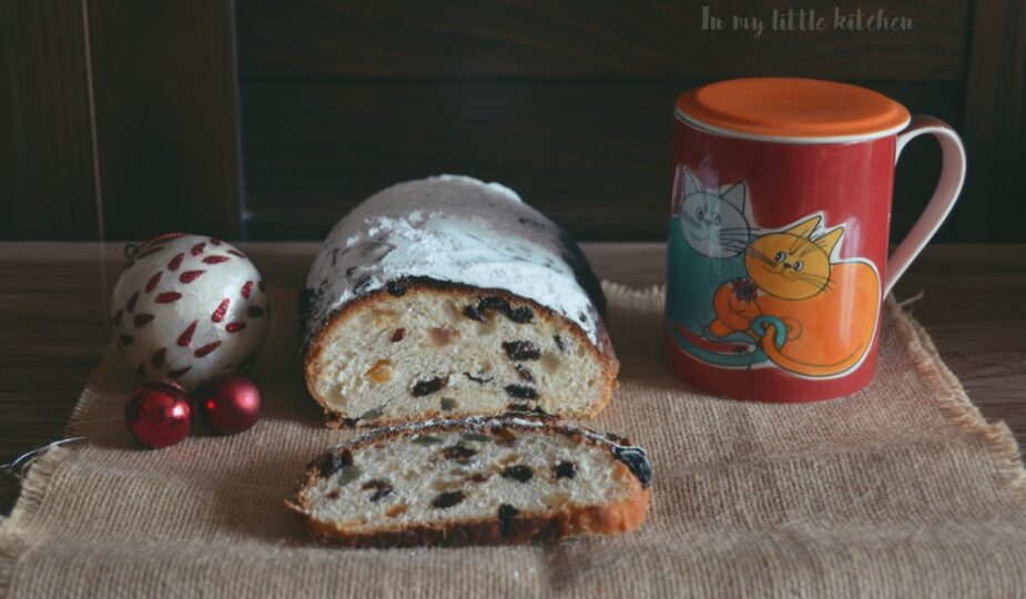 El stollen es un pan muy contundente, lleva mucho azúcar, mucha mantequilla y mucho de todo, así que para comerlo los días de frío es genial. El stollen tiene su orgien en Alemania hace 600 años y tiene una forma característica que quiere recordar al niño Jesús recién nacido con los pañales.