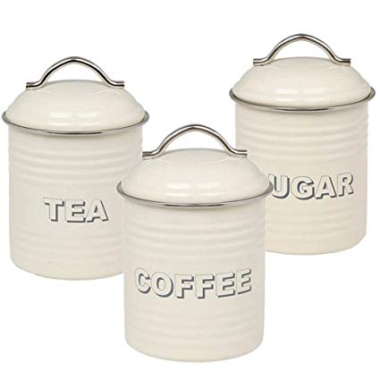 Set de botes metálicos para el té, el café y el azúcar. No me digáis que nos son preciosos, son botes para tenerlos a la vista, adornan las cocinas y creo que son muy cómodos.