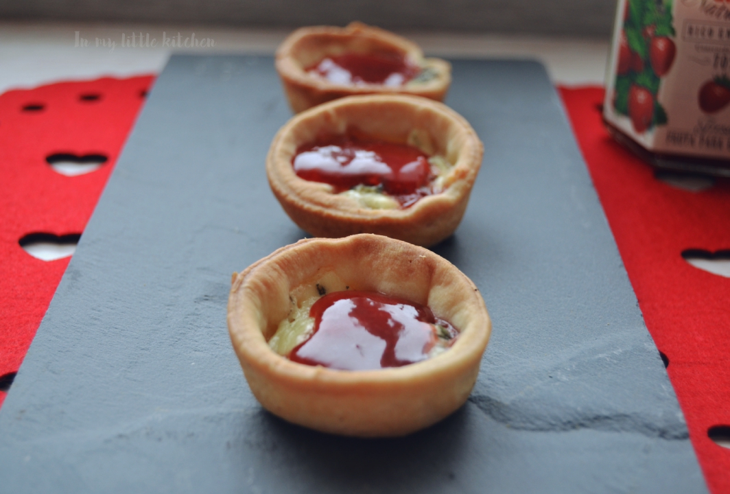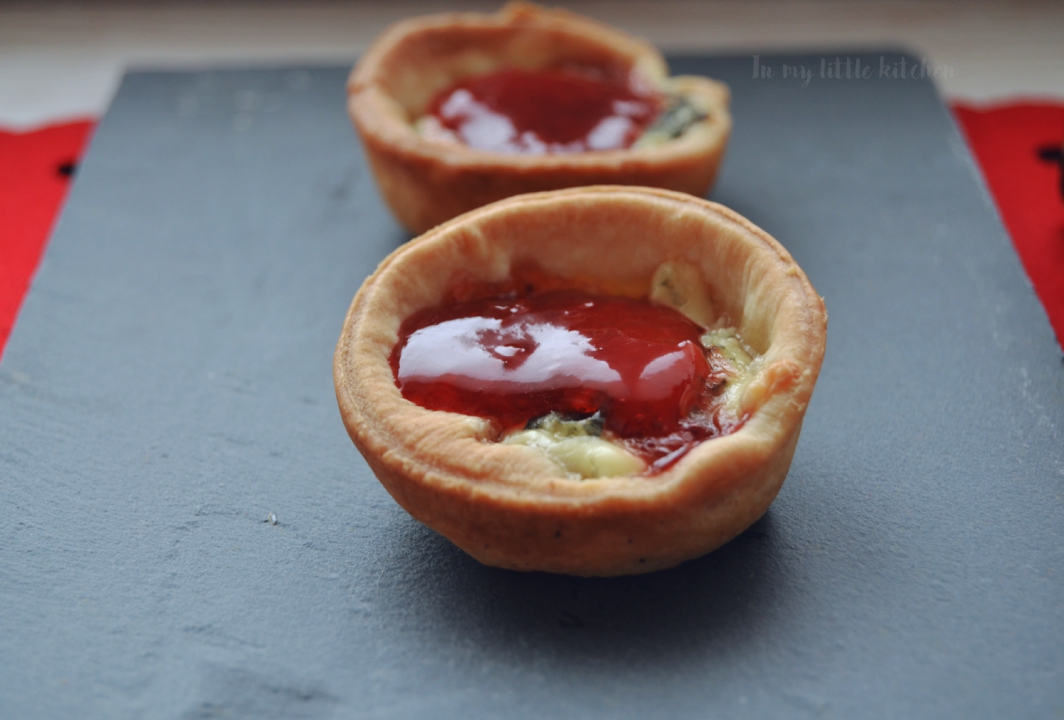 Rellenar la masa con trocitos de queso azul y ponerle encima un poquito de mermelada de fresa por encima.