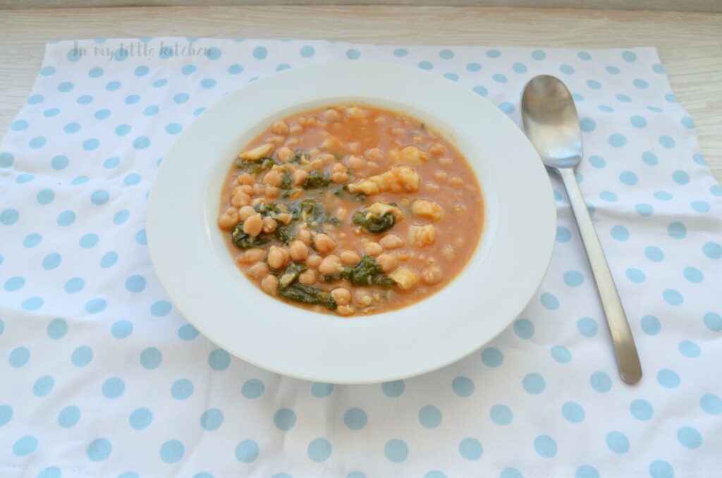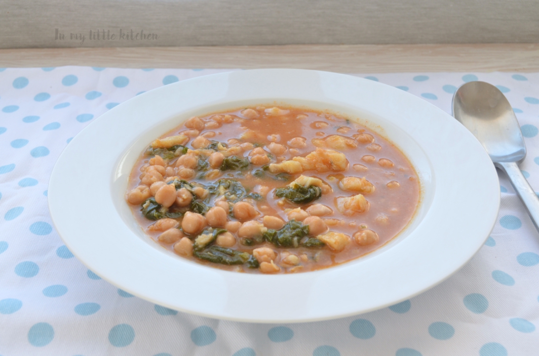 No podía hacer otra cosa que no fuera un buen potaje de garbanzos con espinacas y bacalao… ¡y ya! porque lo que no puedo comer es ajo (me sienta fatal) y la cebolla no pude añadirla porque, aunque no me sienta del todo mal, sólo puedo introducir un alimento por ingesta.