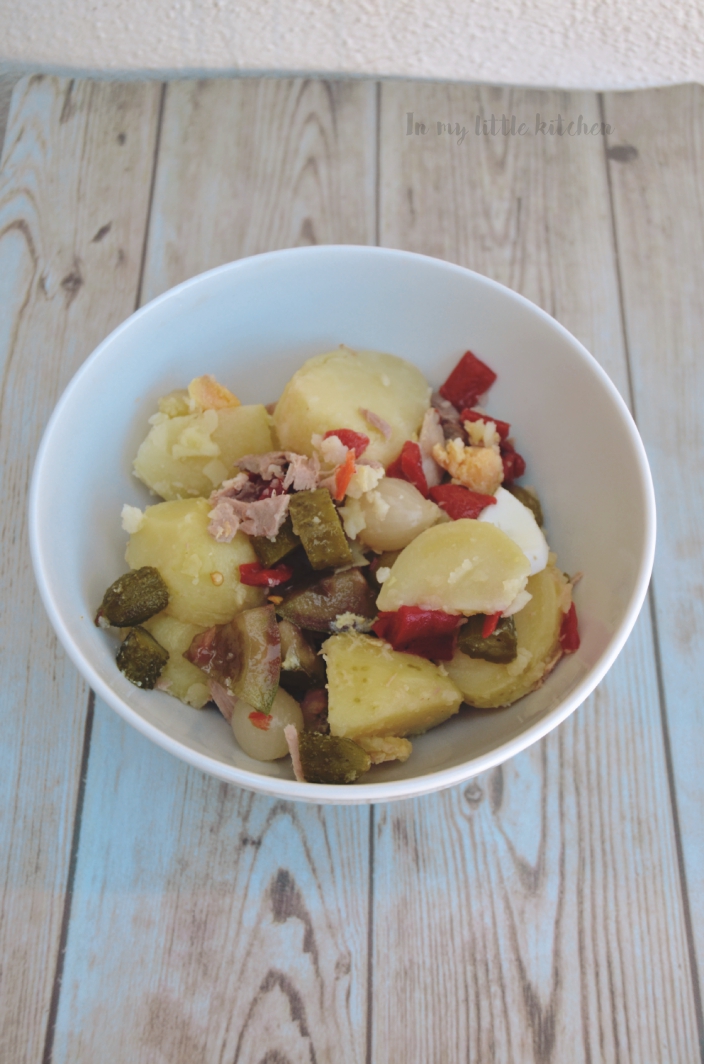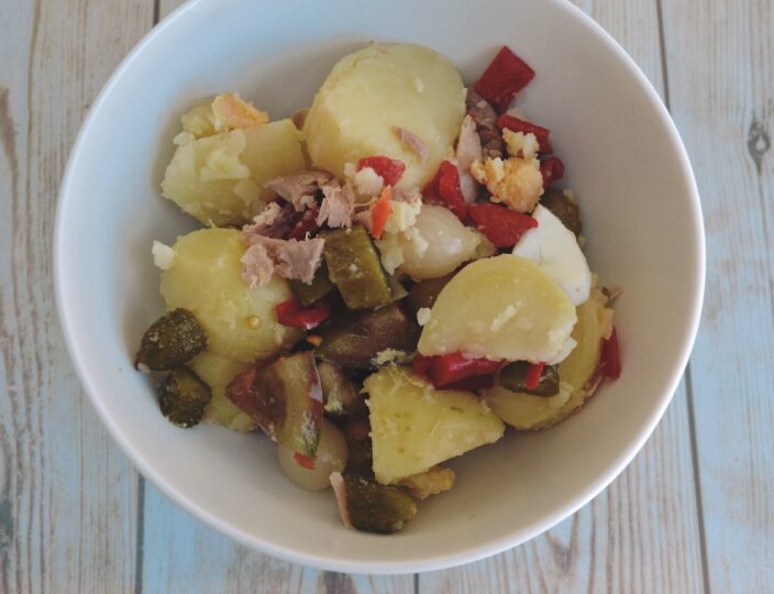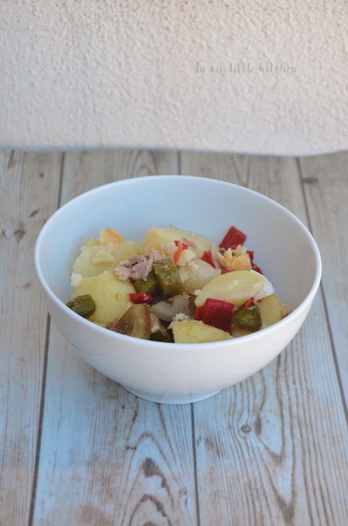 La receta que os traigo hoy es una receta que en mi casa se ha comido todos los verano, durante muchos años, se trata de una ensalada de patata que no puede ser más fresca y veraniega, además la podemos dejar hecha con antelación y cuando volvamos de la playa, o la piscina la tenemos lista para comer, o incluso podemos llevarla con nosotros. Es absolutamente deliciosa y muy fácil de hacer.