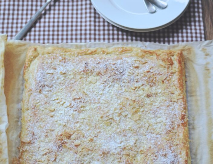 La pantxineta es un postre típicamente vasco hecho con hojaldre y crema pastelera y con almendras por encima. Puede parecer algo contundente pero no, se trata de una tarta ligera, nada dulce y que en casa nos ha conquistado. Además es muy fácil de hacer, yo no había hecho nunca crema pastelera y salió espectacular, eso sí, siguiendo al pie de la letra la receta de Helen, ella no defrauda nunca, y yo me fío de ella plenamente. Se puede hacer la crema pastelera el día anterior (para asegurarnos que esté fría) y cocer la pantxineta el mismo día que la vayamos a comer, degustarla tibia es una maravilla.