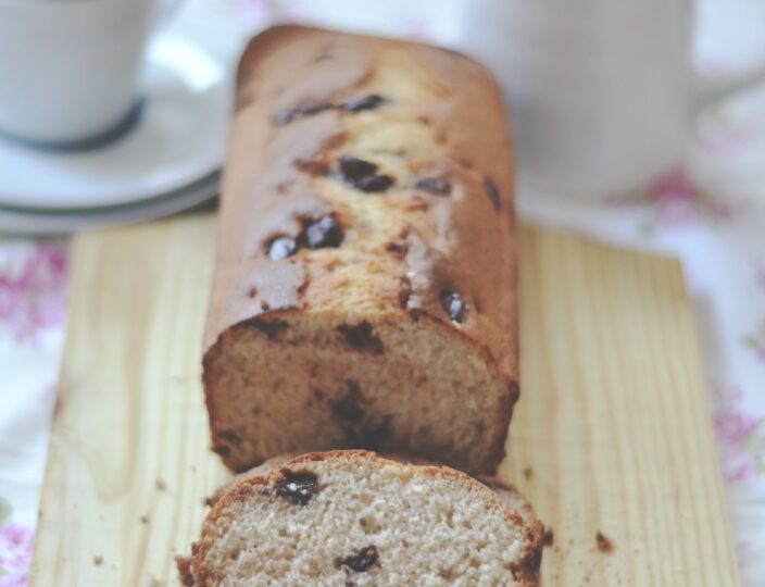 Verter sobre el molde y poner unas chips de chocolate por encima. Llevar al horno y tenerlo a 180º durante 45 minutos. Si vemos que se está tostando de más pero no está hecho se puede tapar con papel de aluminio para que no se queme la parte de arriba.