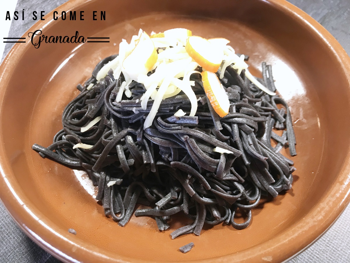 Espaguetis de arroz negros con sabor a mar de Así se come en Granada: Elvira ha querido inspirarse en los colores del cuadro, destacando el vestido negro de nuestra Madame X para hacer su propuesta.