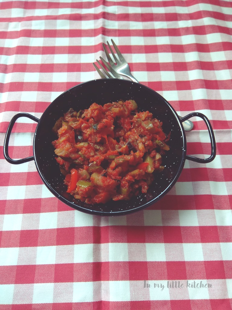 En esta ocasión, me decidí por una receta de toda la vida, que se ha comido en casa de mi abuela Rosa siempre, y que yo, cuando era pequeña «ayudaba» a cocinar, un pisto, receta de Patricia. En mi casa no se usaba berenjena, pero yo sí que la usado y no he puesto ajo, ya que, como sabéis no puedo comerlo. Tengo que decir que el resultado es delicioso.