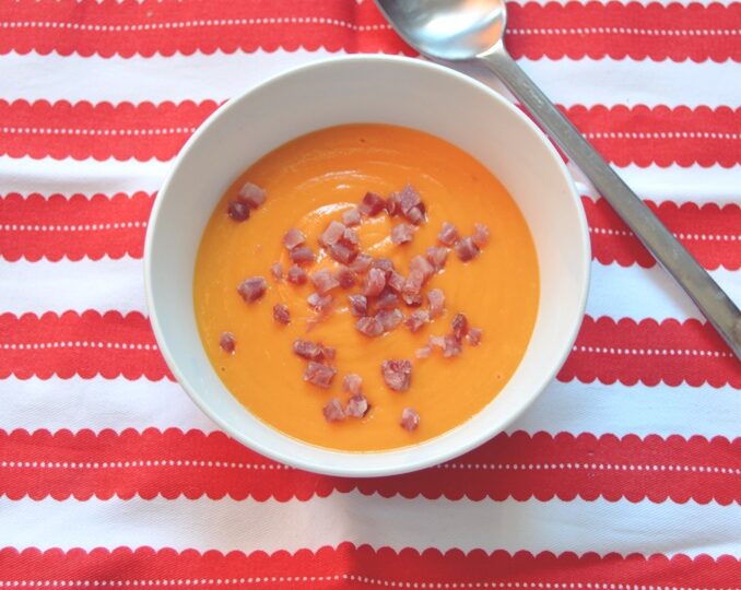Para recrear ese rojo, nada mejor que los tomates, y por eso elegí hacer un salmorejo con los tomates asados, que había visto Crockpotting que se come frío, que es apto para estos últimos días de verano y que en casa nos encanta. Nosotros en esta ocasión lo hemos hecho con pan sin gluten y muy poquito ajo, los tomates están asados en la crockpot pero vosotros podéis hacerlo con el pan normal, con ajo al gusto y con los tomates asados en el horno. Además, por encima a nosotros nos gusta ponerle jamón serrano en taquitos, pero podéis agregarle huevo cocido o las dos cosas.