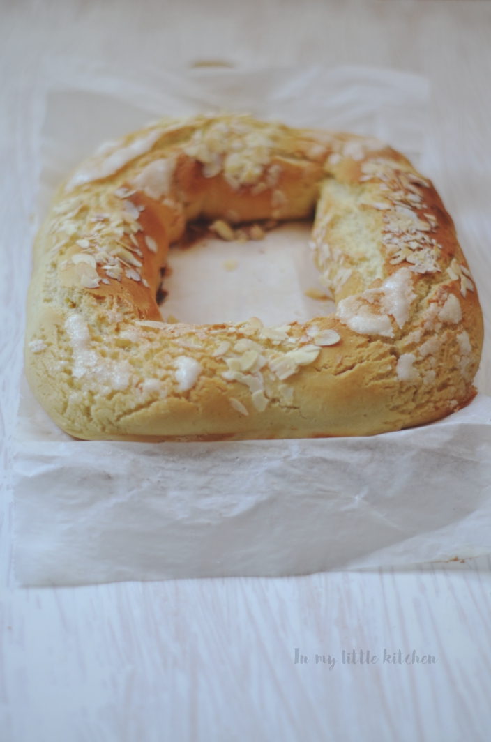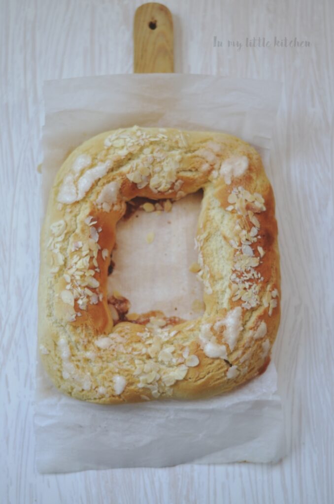 Precalentar el horno a 230º con calor arriba y abajo. Hornear el roscón durante 15 minutos más o menos. Ya sabéis que cada horno es un mundo, por lo que lo mejor es estar pendiente para que no quede tostado de más o crudo.