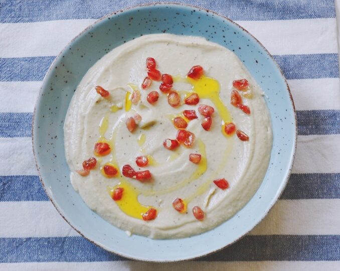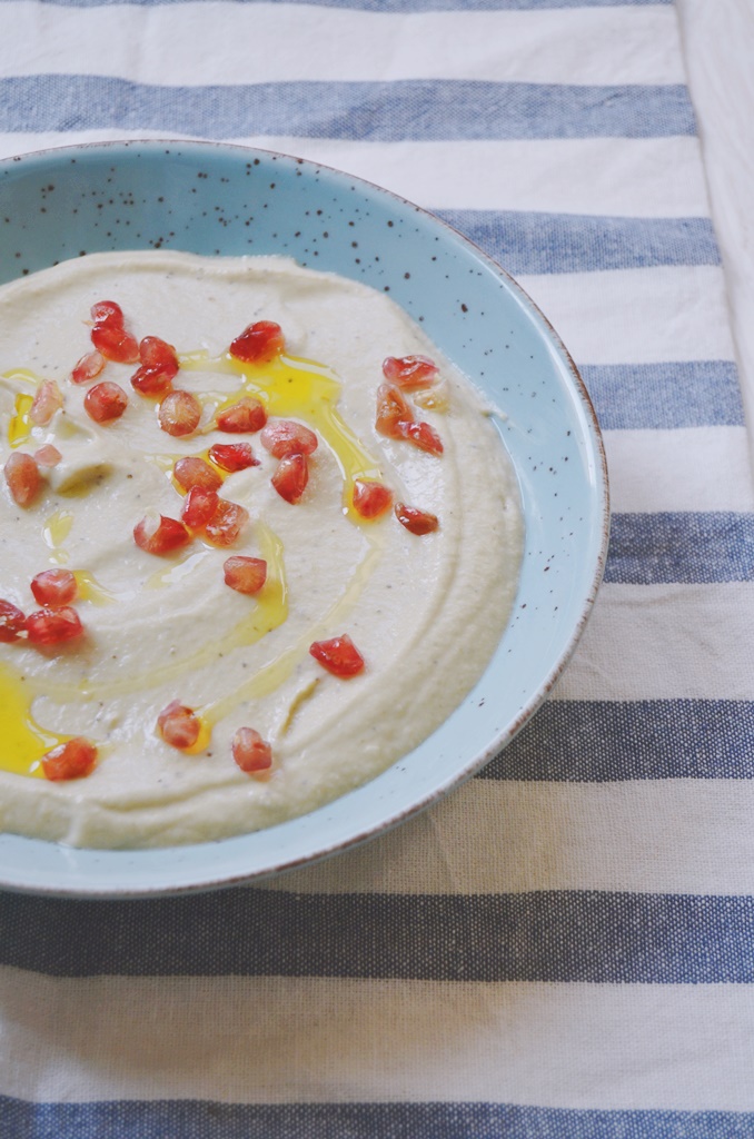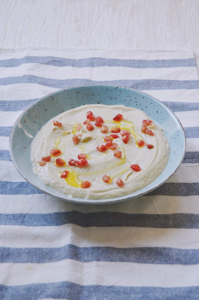 Una vez estén las berenjenas frías, quitar la piel o sacar la carne y poner la carne en un procesador de alimentos. Añadir el resto de ingredientes excepto la granada y triturar bien hasta que quede en una textura de crema.