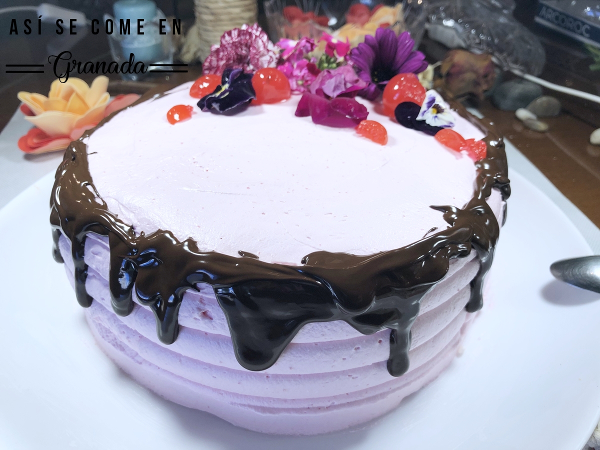 Tarta Maruja Mayo de Así se come en Granada: Elvira se ha inspirado en el color y la textura dela tarta le ha recordado al cuadro, por su sabor, porque es ligera, fresca, la frescura de las fresas le han recordado a la valentía de la artista.