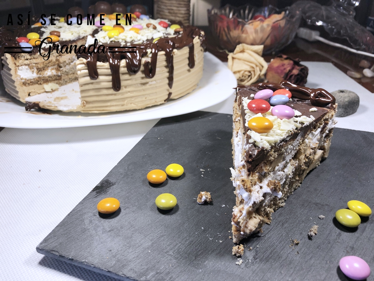 Tarta de galletas, café y whisky sin gluten de Así se come en Granada: A Elvira le dio mucho trabajo el reto este mes, pero al final quedó muy satisfecha con esta tarta de galletas inspirándose en la forma del edificio y en su altura.