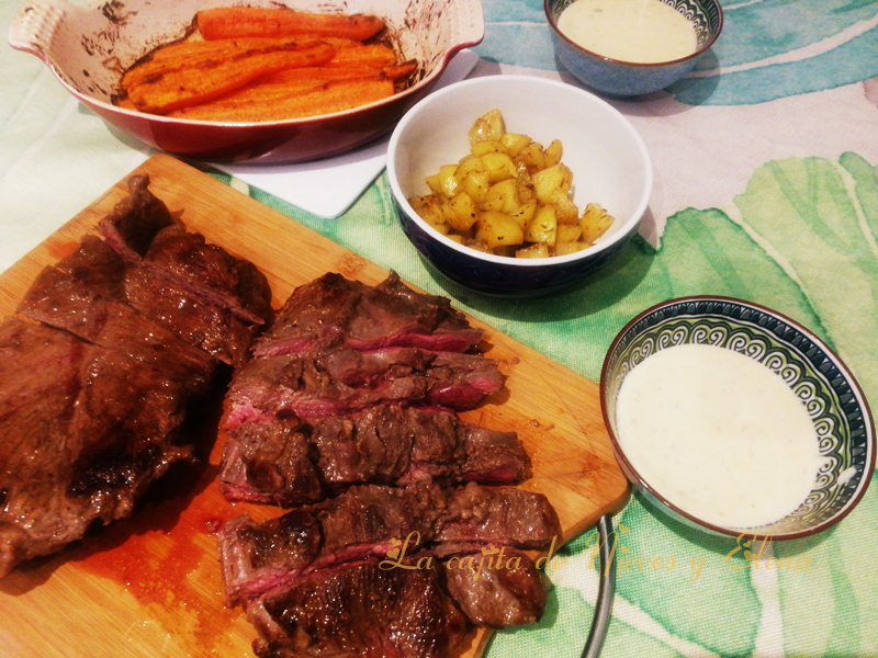 Flat iron steak con zanahorias asadas y salsa de queso azul de La cajita de Nieves y Elena: Las chicas de la cajita me descubren este corte de carne que cada vez es más conocido en Estados Unidos.