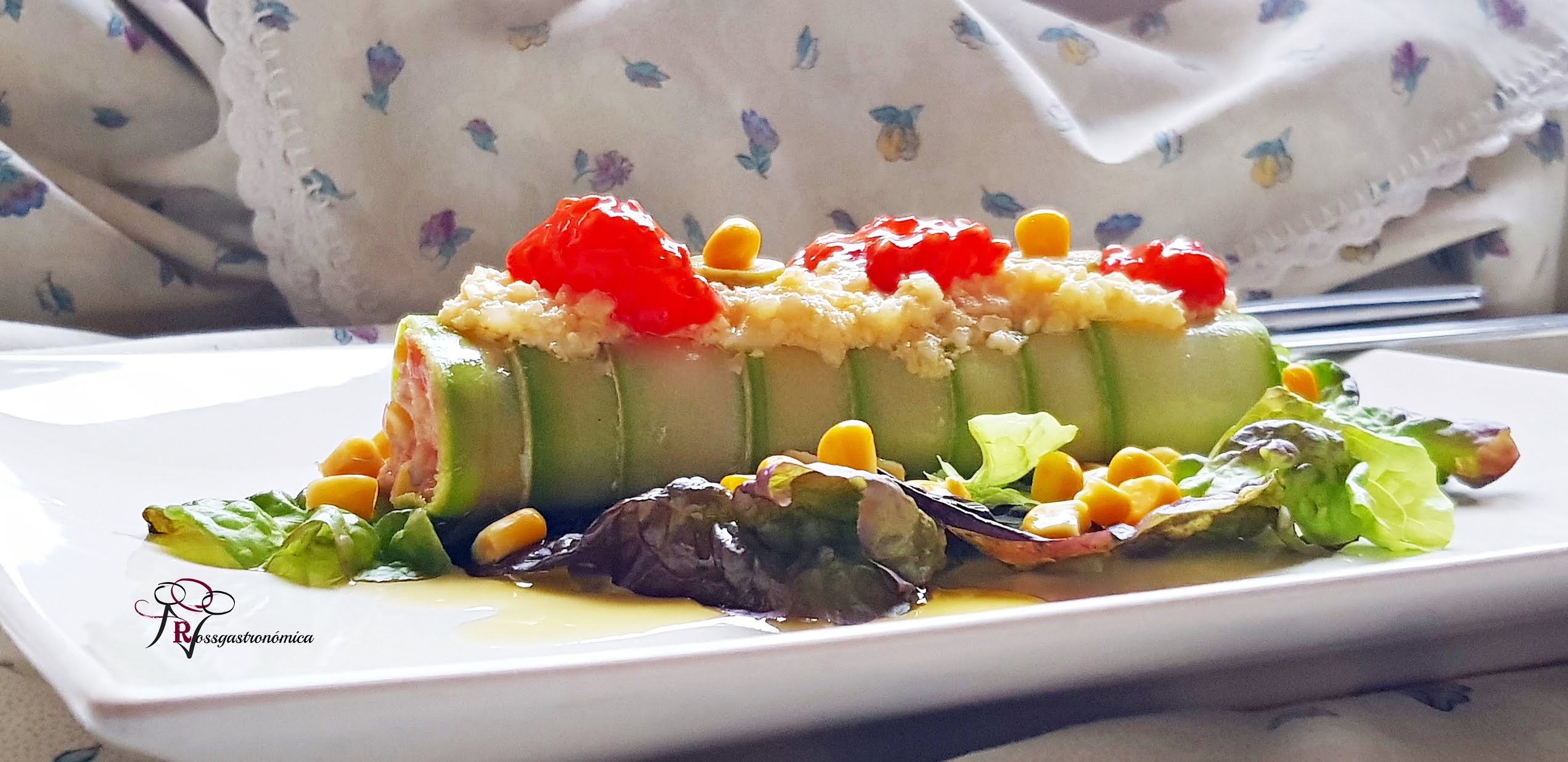 Canelon de calabacín relleno de panzanetta de RossGastronómica: Rosalía se inspiró nada más ver el edificio, y quiso mostrar la forma alargada del edificio y los veintidós pisos que lo componen.