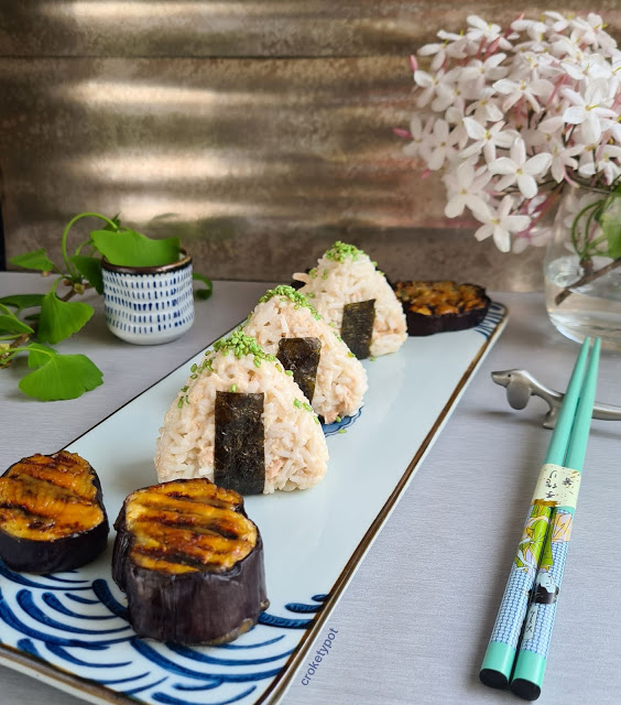 Onigiri de atún con mayonesa y berenjena a la plancha con miso de CroketyPot: Kety se inspiró en la forma triangular del edificio.