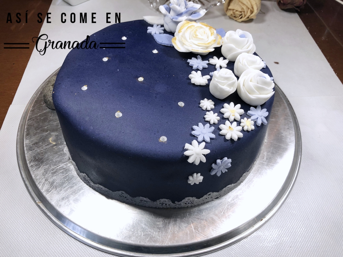 Noche estrellada, tarta fondant sin gluten y sin lactosa de Así se come en Granada: Elvira se ha inspirado en los colores sobre todo en el azul de la noche, las estrellas y la media luna formada por las flores.