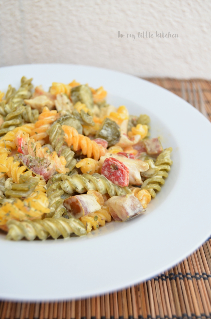 Ensalada de pasta sin gluten con aliño de mayonesa de mostaza: Las ensaladas de pasta resultan geniales para los picnics al aire libre. Son muy versátiles, admiten casi cualquier cosa y son muy fáciles de llevar a cualquier lado. Esta en concreto va aliñada con una mayonesa de mostaza estupenda, y lleva pollo a la plancha, pimientos de piquillo y tomates kumato, pero como siempre os digo podéis añadirle lo que más os guste a vosotros.