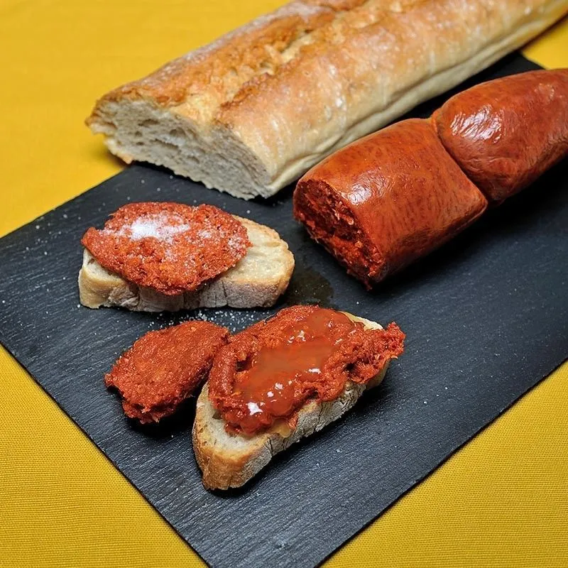 La sobrasada mallorquina es un embutido crudo, curado que se hace a partir de carne de cerdo condimentada con sal, pimentón y pimienta. Se embute en la tripa y se madura lentamente.