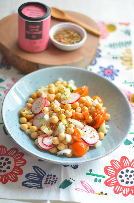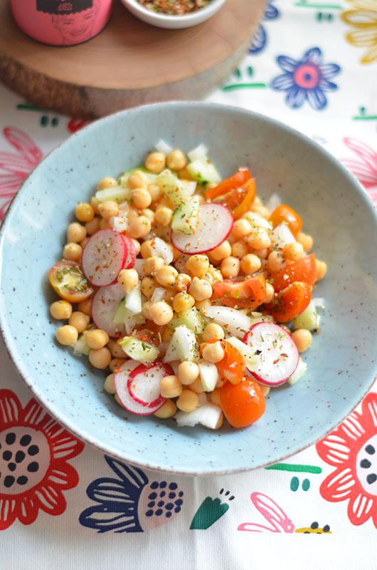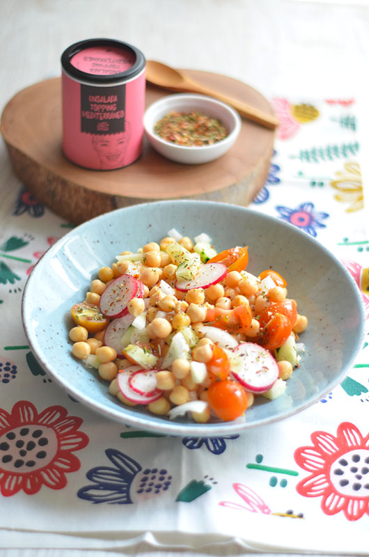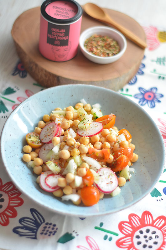 En casa nos gustan mucho los garbanzos en ensalada, y toda la legumbre en general. Esta en concreto está aderezada con la mezcla de especias de Just Spices que venían en la caja Degustabox de este mes de la que os hablo aquí.