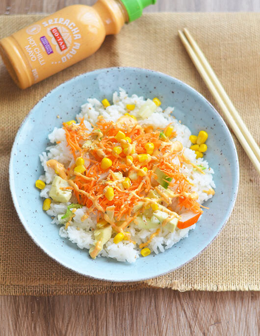 Este California roll bowl es como si deshiciéramos un California Roll y lo pusiéramos sobre un plato. Pincha en el enlace para ver la receta